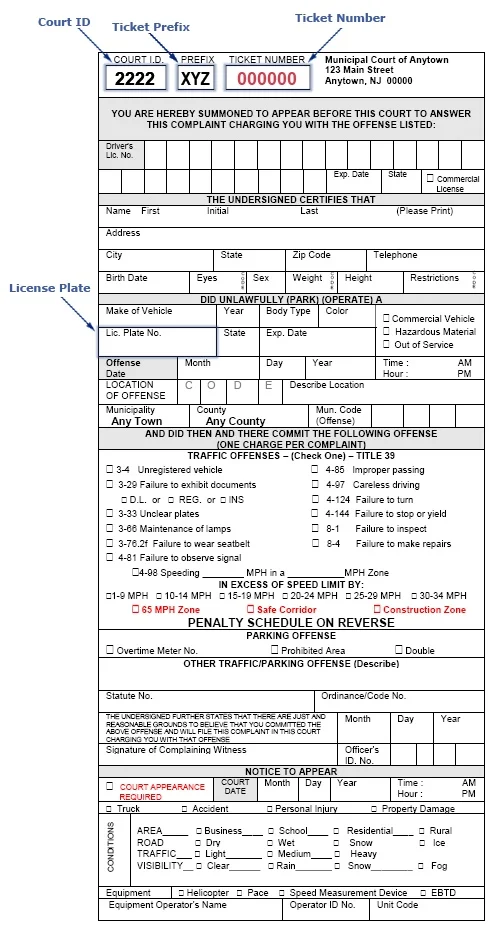 違反チケットには違反内容、罰金の額と支払先、そして不服を申し立てる場合に連絡すべき裁判所の電話番号と住所が記載されています。