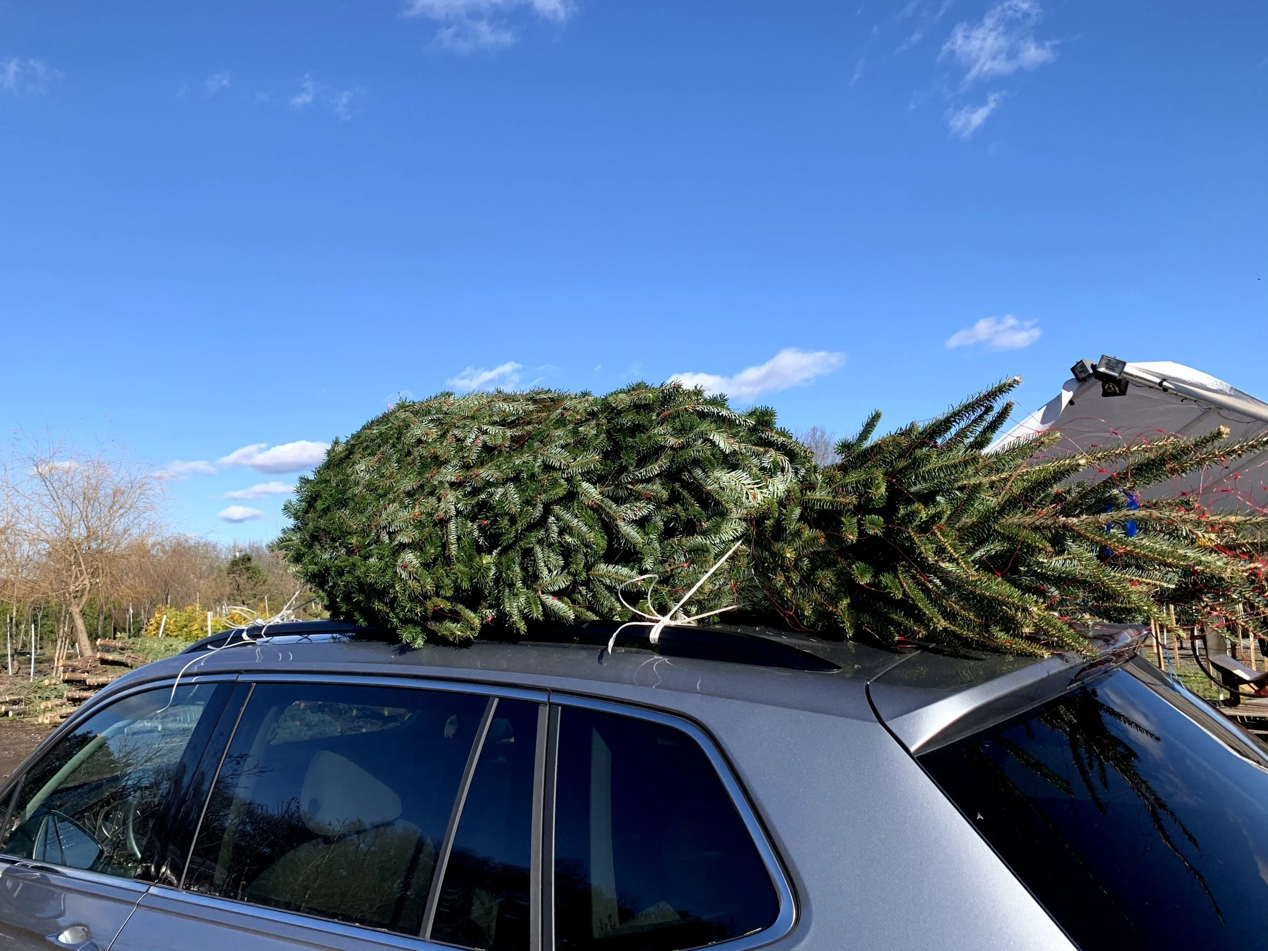 去年は車の中に入れるという愚行を犯して奥さんに叱られましたが(葉っぱがポロポロ落ちるので掃除が大変)今年は車の上にくくりつけてもらいました。今年は自宅用にも買ったので2本車の上に乗せて走りました。😅