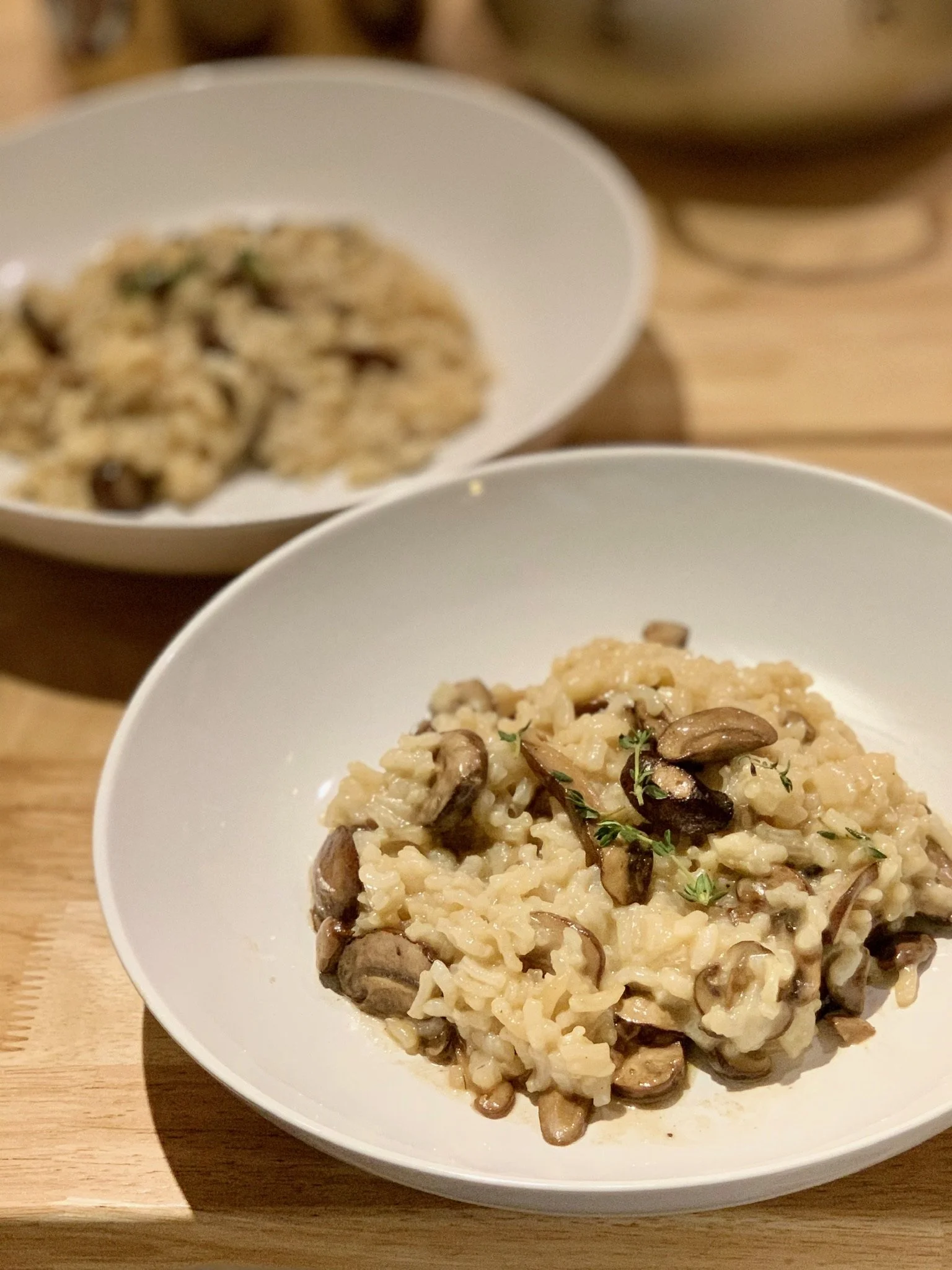 オリーブオイルでにんにくを炒め香りを出して、野菜を炒め首骨まわりのお肉をむしったものとキノコ類を加え、火が通ったらお米を加えてツヤツヤになったら昨晩作ったスープで20−30分ほど煮込みます。