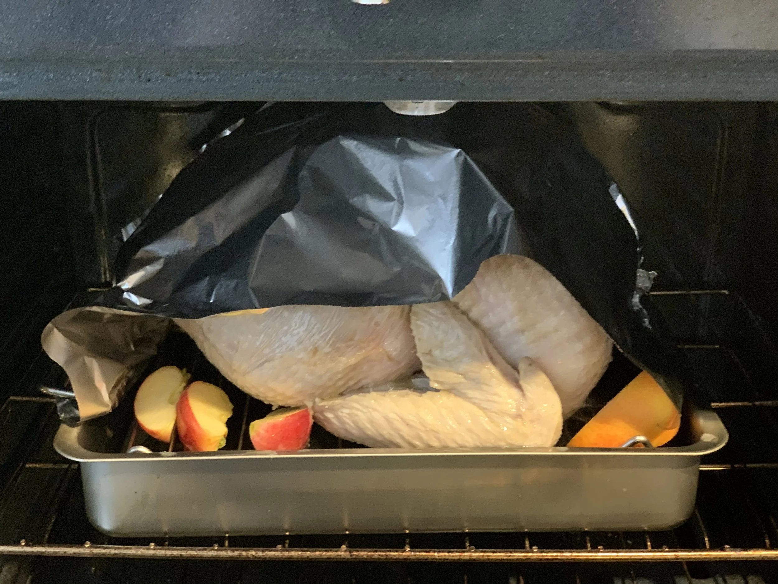 スタッフィングは上手く焼かないと食中毒の危険もあるそうなので中には詰めないで代わりに風味づけとしてブライン液に入れていたリンゴやオレンジを入れます。