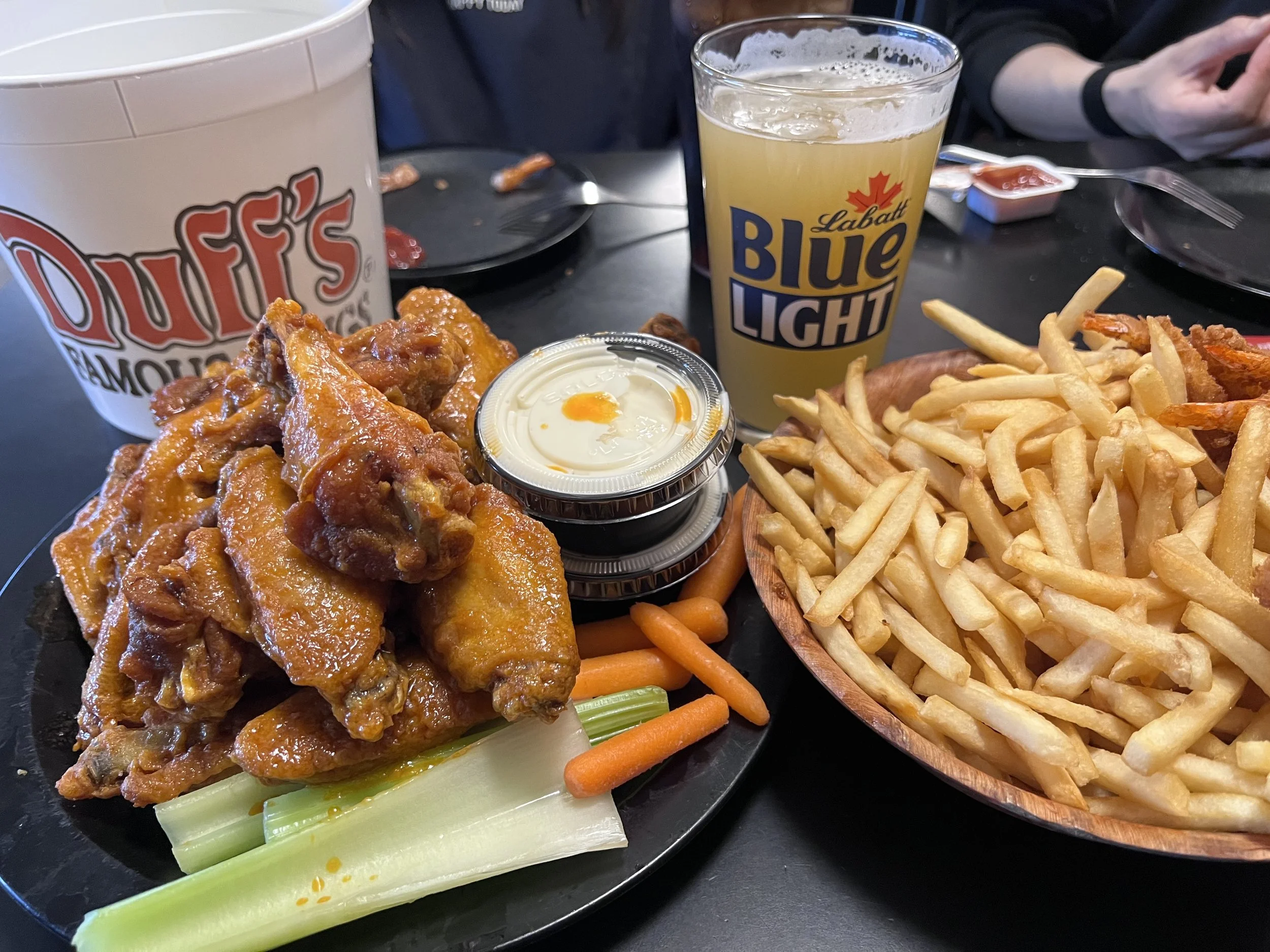 途中でランチをはさんだのですが、バッファローウィング発祥の地がナイアガラの滝近くと聞き、知り合いに勧められたお店、Duff’sに立ち寄ることに。